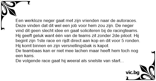 De man antwoord: awel, in 1ste geen probleem, in 2de alles in orde, in 3de prima, in 4de goede snelheid, in 5de topsnelheid maar als ik naar de R van racing ga dan krijgt hij het!!