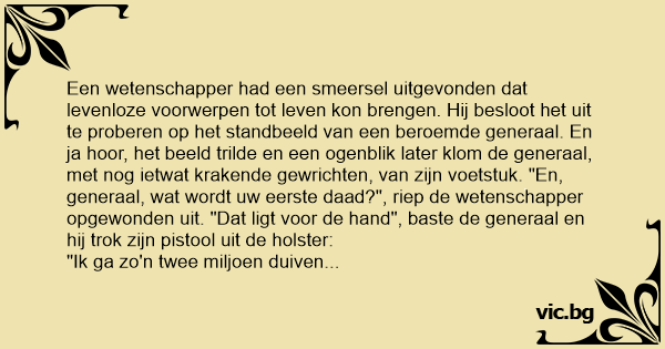 Een wetenschapper had een smeersel uitgevonden dat levenloze voorwerpen tot leven kon brengen. Hij besloot het uit te proberen op het standbeeld van een beroemde generaal. En ja hооr, het beeld trilde en een ogenblik later klom de generaal, met nog ietwat krakende gewrichten, van zijn voetstuk. "En, generaal, wat wordt uw eerste daad?", riep de wetenschapper opgewonden uit. "Dat ligt voor de hand", baste de generaal en hij trok zijn pistool uit de holster: