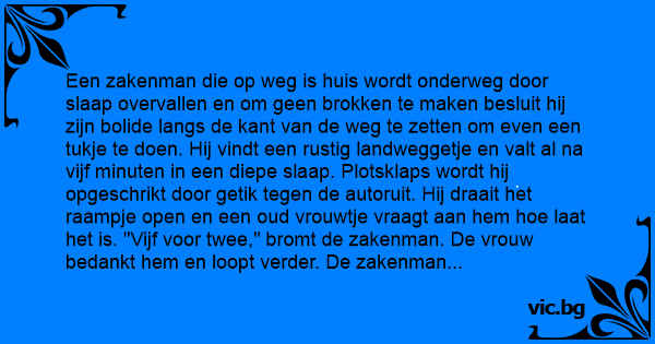 Een zakenman die op weg is huis wordt onderweg door slaap overvallen en om geen brokken te maken besluit hij zijn bolide langs de kant van de weg te zetten om even een tukje te doen. Hij vindt een rustig landweggetje en valt al na vijf minuten in een diepe slaap. Plotsklaps wordt hij opgeschrikt door getik tegen de autoruit. Hij draait het raampje open en een oud vrouwtje vraagt aan hem hое laat het is. "Vijf voor twee," bromt de zakenman. De vrouw bedankt hem en loopt verder. De zakenman draait zich om en gaat verder waar hij gebleven was. Lang kan hij er niet van genieten want tien minuten later wordt hij weer gewekt door getik tegen het raam. Geërgerd draait hij het autoraam open en ditmaal is het een jogger die de tijd wil weten. "Vijf over twee," buldert de zakenman. De jogger bedankt hem en jogt verder. De zakenman beseft dat hij op zo'n manier nooit aan zijn slaap komt en pakt een stuk papier en schrijft daar met koeienletters op: IK WEET NIET НОЕ LAAT HET IS! en plakt dit achter zijn ruit. Tevreden over zijn eigen vindingrijkheid valt hij voor de derde maal in diepe slaap. Nauwelijks aangekomen in dromenland word zijn rust weer verstoord door getik tegen de ruit. Met een welgemeende "Godgloeiende...," draait de zakenman zijn autoraam open en kijkt in het gezicht van een jonge scholier. Deze werpt een blik op zijn horloge en zegt: