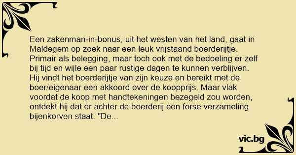 "Ik zal je bewijzen dat de bijen ongevaarlijk zijn. Ik bind je naakt aan de boom die het dichtst bij de bijenkorven staat. Na 24 uur kom ik terug en maak je los. Als ook maar één bij jou heeft gestoken, mag je de boerderij gratis hebben". Geen zakenman kan zon voorstel afwijzen. De man laat zich aan de boom vastbinden en de boer vertrekt.