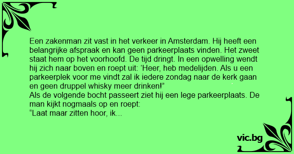 Een zakenman zit vast in het verkeer in Amsterdam. Hij heeft een belangrijke afspraak en kan geen parkeerplaats vinden. Het zweet staat hem op het voorhoofd. De tijd dringt. In een opwelling wendt hij zich naar boven en roept uit: ‘Heer, heb medelijden. Als u een parkeerplek voor me vindt zal ik iedere zondag naar de kerk gaan en geen druppel whisky meer drinken!”