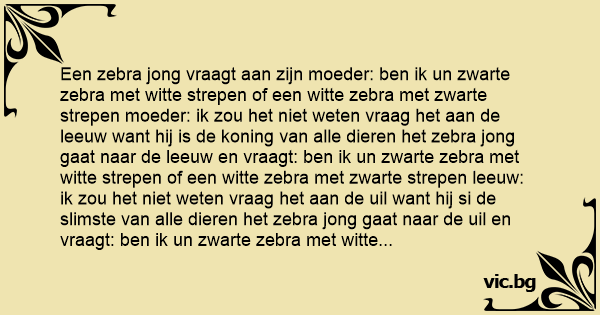 Een zebra jong vraagt aan zijn moeder: ben ik un zwarte zebra met witte strepen of een witte zebra met zwarte strepen moeder: ik zou het niet weten vraag het aan de leeuw want hij is de koning van alle dieren het zebra jong gaat naar de leeuw en vraagt: ben ik un zwarte zebra met witte strepen of een witte zebra met zwarte strepen leeuw: ik zou het niet weten vraag het aan de uil want hij si de slimste van alle dieren het zebra jong gaat naar de uil en vraagt: ben ik un zwarte zebra met witte strepen of een witte zebra met zwarte strepen uil nou jij веnт een witte zebra met zwarte strepen het zebra jong vraagt waarom en de uil antwoord als jij een zwarte zeebra met witte strepen was dan vroeg je: Jo man, ben ik un zwarte zeeebra mit witte streepu of ben k un wittuh zeebraa mit zartuh streepu Jo,,,,,,