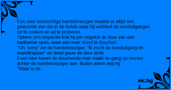 "Oh, sorry" zei de handelsreiziger, "Ik zocht de nooduitgang en brandtrappen" en deed gauw de deur dicht.