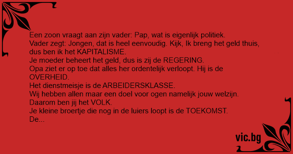 Едно дете го прашува својот татко: - Тато што е тоа политика? - Епа тоа ти е вака сине: Јас во фамилијава заработувам, значи јас сум капитализам, јас им плаќам на чистачката и дадилката значи тие...