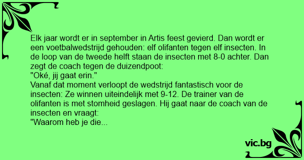 Vanaf dat moment verloopt de wedstrijd fantastisch voor de insecten: Ze winnen uiteindelijk met 9-12. De trainer van de olifanten is met stomheid geslagen. Hij gaat naar de coach van de insecten en vraagt: