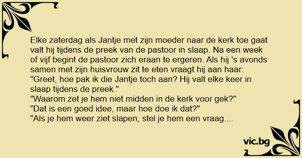 Elke zaterdag als Jantje met zijn moeder naar de kerk toe gaat valt hij tijdens de preek van de pastoor in slaap. Na een week of vijf begint de pastoor zich eraan te ergeren. Als hij 's avonds samen met zijn huisvrouw zit te eten vraagt hij aan haar: