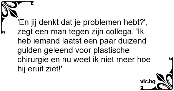 'En jij denkt dat je problemen hebt?', zegt een man tegen zijn collega. 'Ik heb iemand laatst een paar duizend gulden geleend voor plastische chirurgie en nu weet ik niet meer hое hij eruit ziet!'