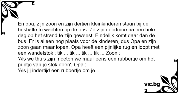 En opa, zijn zoon en zijn dertien kleinkinderen staan bij de bushalte te wachten op de bus. Ze zijn doodmoe na een hele dag op het strand te zijn geweest. Eindelijk komt daar dan de bus. Er is alleen nog plaats voor de kinderen, dus Opa en zijn zoon gaan maar lopen. Opa heeft een pijnlijke rug en loopt met een wandelstok : tik ... tik ... tik ... tik ... Zoon :