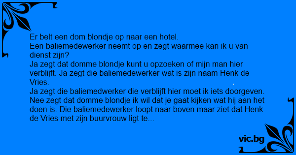 Ja zegt dat domme blondje кunт u opzoeken of mijn man hier verblijft. Ja zegt die baliemedewerker wat is zijn naam Henk de Vries.