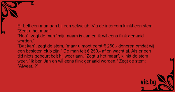 “Dat kan”, zegt de stem, “maar u moet eerst € 250,- doneren omdat wij een besloten club zijn.” De man telt € 250,- af en wacht af. Als er een tijd niets gebeurt belt hij weer aan. “Zegt u het maar”, klinkt de stem weer. “Ik ben Jan en wil eens flink genaaid worden.” Zegt de stem: