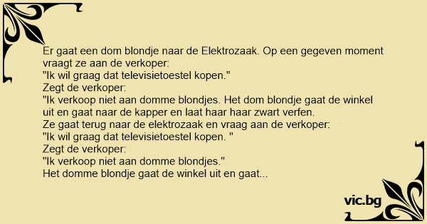 Een dom blondje komt de elektronicawinkel binnenlopen en vraagt aan de verkoper “Mag ik die TV kopen?” Waarop de verkoper antwoordt “Wij verkopen niet aan domme blondjes” Paar dagen later komt...