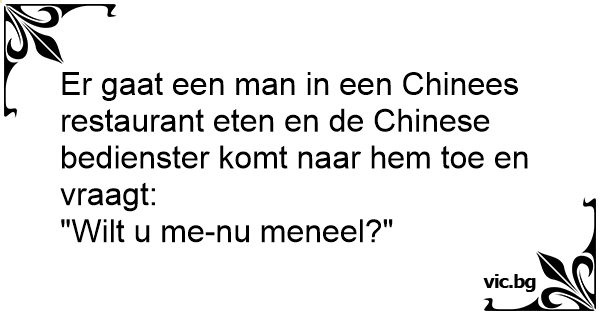 Er gaat een man in een Chinees restaurant eten en de Chinese bedienster komt naar hem toe en vraagt: