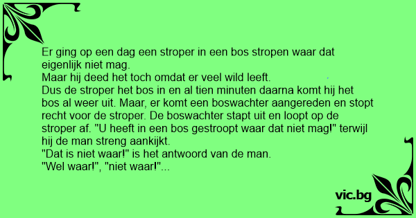 Dus de stroper het bos in en al tien minuten daarna komt hij het bos al weer uit. Maar, er komt een boswachter aangereden en stopt recht voor de stroper. De boswachter stapt uit en loopt op de stroper af. "U heeft in een bos gestroopt waar dat niet mag!" terwijl hij de man streng aankijkt.