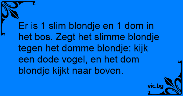 Er is 1 slim blondje en 1 dom in het bos. Zegt het slimme blondje tegen het domme blondje: kijk een dode vogel, en het dom blondje kijkt naar boven.