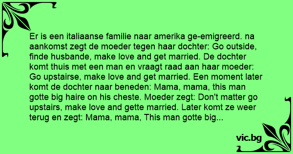 Er is een italiaanse familie naar amerika ge-emigreerd. na aankomst zegt de moeder tegen haar dochter: Go outside, finde husbande, make love and get married. De dochter komt thuis met een man en vraagt raad aan haar moeder: Go upstairse, make love and get married. Een moment later komt de dochter naar beneden: Mama, mama, this man gotte big haire on his cheste. Moeder zegt: Don't matter go upstairs, make love and gette married. Later komt ze weer terug en zegt: Mama, mama, This man gotte big haire between his legs. Moeder zegt: Don't matter go upstairs, make love and gette married. Later komt ze weer terug: Mama,mama, This man got a really big thing between his legs. Zegt de moeder: STAY HERE, THAT'S FOR THE MAMA.