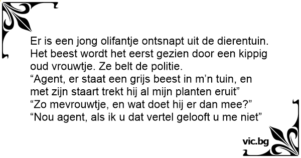 “Agent, er staat een grijs beest in m’n tuin, en met zijn staart trekt hij al mijn planten eruit”