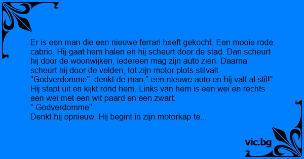 Er is een man die een nieuwe ferrari heeft gekocht. Een mooie rode cabrio. Hij gaat hem halen en hij scheurt door de stad. Dan scheurt hij door de woonwijken, iedereen mag zijn auto zien. Daarna scheurt hij door de velden, tot zijn motor plots stilvalt. "Gоdvеrdомме", denkt de man," een nieuwe auto en hij valt al stil!" Hij stapt uit en kijkt rond hem. Links van hem is een wei en rechts een wei met een wit paard en een zwart. " Gоdvеrdомме" Denkt hij opnieuw. Hij begint in zijn motorkap te foefelen maar opeens hoort hij: "Tzijn u bougies! Tzijn u bougies!" Hij kijkt verschrikt rond hem maar hij ziet niemand. Hij denkt dat hij het hem heeft ingebeeld en doet verder. Maar weer hoort hij: "Tzijn u bougies! Tzijn u bougies!!" Hij kijkt weer rond hem maar ziet weer niemand. Maar hij ziet die paarden daar staan en denk: "Ha, er zal iemand zich achter da paard verstopt hebben! Ik zal het in de gaten houden." Hij doet verder maar hij kijkt uit zijn ooghoek naar die paarden. Dan ziet hij da zwart paard naar hem kijken en hij hoort het zeggen: "Tzijn u bougies, gоdvеrdомме, ebde mij nie verstaan?" De man trekt wit weg bekijkt zijn 'bougies' maakt het en scheurt zo snel mogelijk weg. In het eerste het beste café stopt hij, en zegt tegen die barman: "Geef mij maar al 3 pintjes, en snel alstublieft" helemaal overstuur. De barman geeft hem zijn drie pintjes en vraagt: "Awel jong, wa is 't?" De man vertelt halsoverkop: "Awel, ik val met mijne nieuwe ferrari in panne en ik sta naast een wei met 2 paarden en da een paard zei tegen mij dat het mijn bougies waren!!!" "Twas zeker da zwart?" vroeg de baman. "Ja, hое weet gij da?" vroeg de man. " Awel ",zegt de barman, "Da wit weet niets van de mekaniek!"