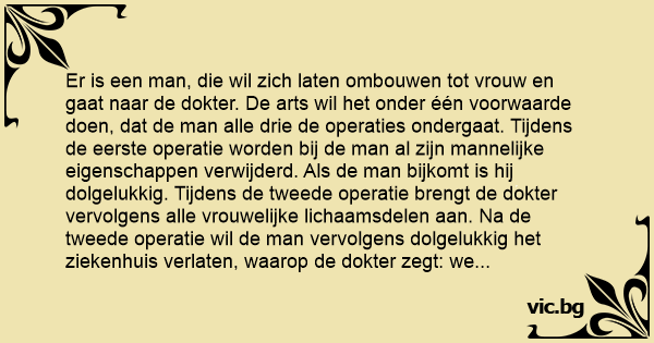 Er is een man, die wil zich laten ombouwen tot vrouw en gaat naar de dokter. De arts wil het onder één voorwaarde doen, dat de man alle drie de operaties ondergaat. Tijdens de eerste operatie worden bij de man al zijn mannelijke eigenschappen verwijderd. Als de man bijkomt is hij dolgelukkig. Tijdens de tweede operatie brengt de dokter vervolgens alle vrouwelijke lichaamsdelen aan. Na de tweede operatie wil de man vervolgens dolgelukkig het ziekenhuis verlaten, waarop de dokter zegt: we hadden afgesproken 3 operaties te doen. Met tegenzin ondergaat hij de derde operatie. Als hij wakker wordt is er volgens hem niets gebeurd. Daarop vraagt hij aan de dokter waarom die derde operatie eigenlijk nodig was. Waarop de dokter vertelt dat een deel van zijn hersens is verwijderd en er een gat in zijn hand is gemaakt.