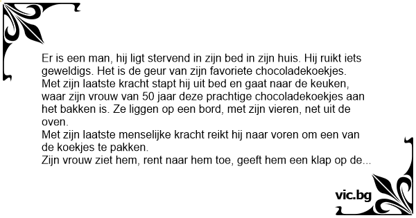 Met zijn laatste kracht stapt hij uit bed en gaat naar de keuken, waar zijn vrouw van 50 jaar deze prachtige chocoladekoekjes aan het bakken is. Ze liggen op een bord, met zijn vieren, net uit de oven.