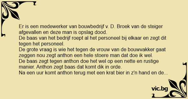 Na een uur komt anthon terug met een krat bier in z'n hand en de baas vraagt waarom heb jij nou een krat bier in je hand nou zegt anthon het ging zo: �k zei goedemorgen weduwe vrouw janssen toen zei de vrouw ach dat lieg je en toen zei ik oke wedden voor een kratje bier.