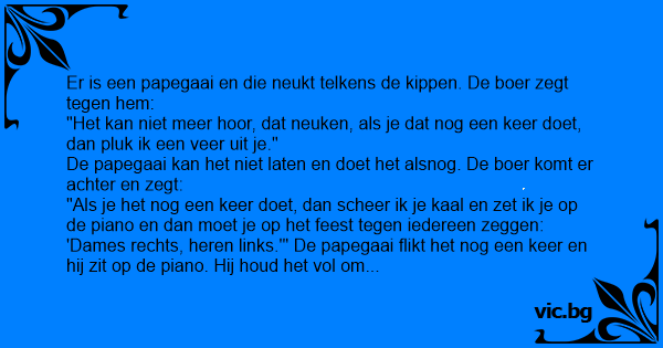 Er is een papegaai en die neukt telkens de kippen. De boer zegt tegen hem: