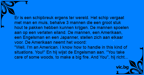 ''Well, I'm an American. I know how to handle in this kind of situations. You!'' En hij wijst de Engelsman aan. ''You take care of some woods, to make a big fire. And You'', hij richt zich tot de Japanner, ''You will take care of the suplies. I'll find some food for us!'' Dus de drie mannen slaan ieder een eigen weg in. Na een tijd komen de Engelsman en de Amerikaan elkaar tegen. Ze hebben beiden volop hout en voedsel verzameld, dus ze besluiten terug te gaan naar de plek die ze als hun kamp hadden aangewezen. Wanneer ze aankomen, is er geen Japanner te zien. Ze besluiten hem te gaan zoeken. Net voor schemering keren ze terug op de plek, zonder de Japanner. Eenmaal zittend bij het vuur springt toch ineens die Japanner uit de bosjes: