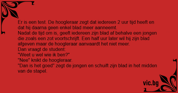 Er is een test. De hoogleraar zegt dat iedereen 2 uur tijd heeft en dat hij daarna geen enkel blad meer aanneemt.