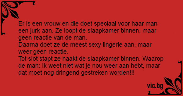 Tot slot stapt ze naakt de slaapkamer binnen. Waarop de man: Ik weet niet wat je nou weer aan hebt, maar dat moet nog dringend gestreken worden!!!