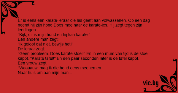 Er is eens een karate-leraar die les geeft aan volwassenen. Op een dag neemt hij zijn hond Does mee naar de karate-les. Hij zegt tegen zijn leerlingen: