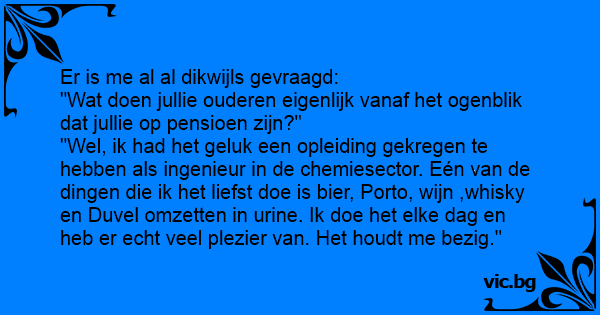 "Wel, ik had het geluk een opleiding gekregen te hebben als ingenieur in de chemiesector. Eén van de dingen die ik het liefst doe is bier, Porto, wijn ,whisky en Duvel omzetten in urinе. Ik doe het elke dag en heb er echt veel plezier van. Het houdt me bezig."