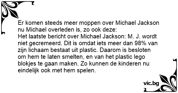 Het laatste bericht over Michael Jackson: M. J. wordt niet gecremeerd. Dit is omdat iets meer dan 98% van zijn lichaam bestaat uit plastic. Daarom is besloten om hem te laten smelten, en van het plastic lego blokjes te gaan maken. Zo kunnen de kinderen nu eindelijk ook met hem spelen.
