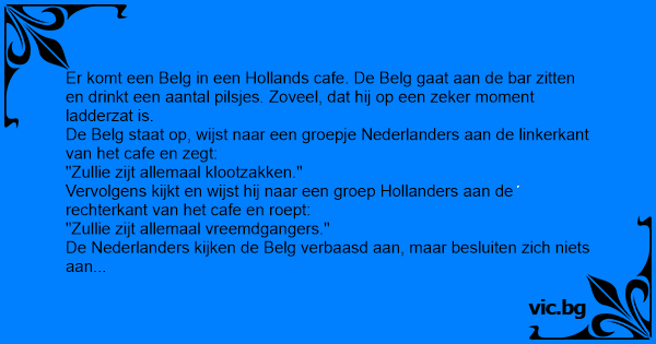Er komt een Belg in een Hollands cafe. De Belg gaat aan de bar zitten en drinkt een aantal pilsjes. Zoveel, dat hij op een zeker moment ladderzat is.