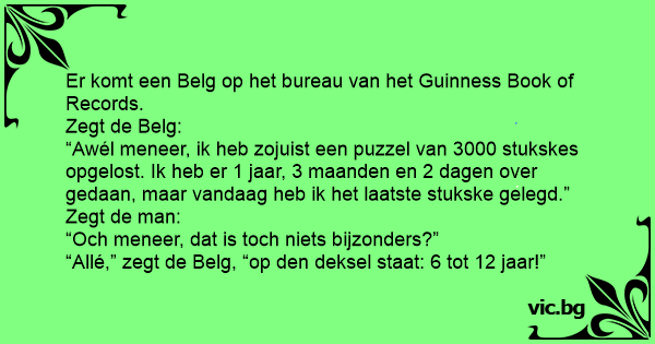 “Awél meneer, ik heb zojuist een puzzel van 3000 stukskes opgelost. Ik heb er 1 jaar, 3 maanden en 2 dagen over gedaan, maar vandaag heb ik het laatste stukske gelegd.” Zegt de man: