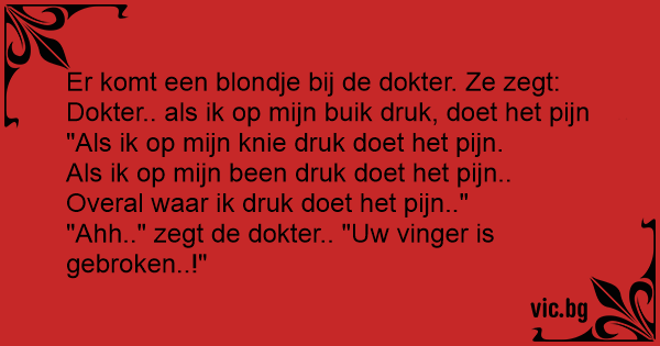 Er komt een dom blondje bij de dokter en zegt: "Als ik op mijn arm druk, dan heb ik pijn. En als ik op mijn been druk, heb ik ook pijn." Wat heeft ze? Ze heeft een gebroken vinger.