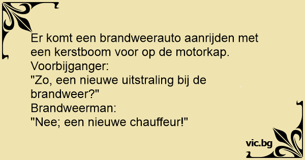Er komt een brandweerauto aanrijden met een kerstboom voor op de motorkap. Voorbijganger: