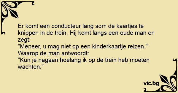 Er komt een conducteur lang som de kaartjes te knippen in de trein. Hij komt langs een oude man en zegt: