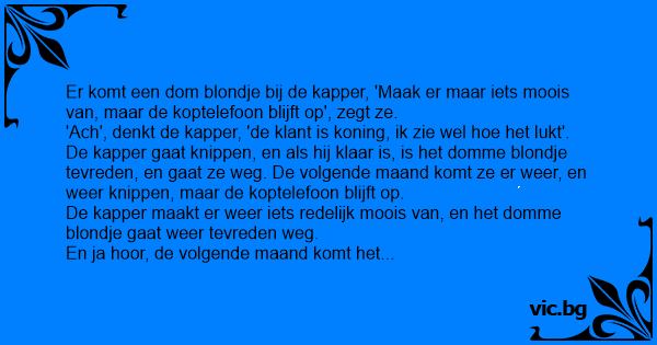 Op een dag komt een dom blondje een kapsalon binnen met een koptelefoon op haar hoofd. Het blondje zegt: "De puntjes bijwerken graag." Kapper: "Zou je dan eerst die koptelefoon van je oren willen...