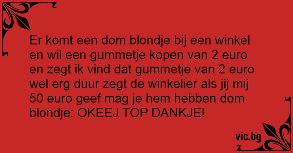 Er komt een dom blondje bij een winkel en wil een gummetje kopen van 2 euro en zegt ik vind dat gummetje van 2 euro wel erg duur zegt de winkelier als jij mij 50 euro geef mag je hem hebben dom blondje: OKEEJ TOP DANKJE!