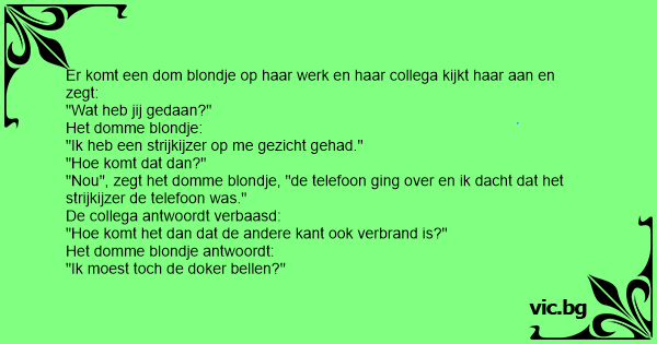 "Nou", zegt het domme blondje, "de telefoon ging over en ik dacht dat het strijkijzer de telefoon was."