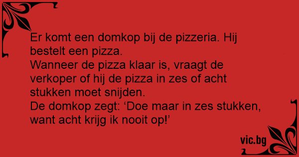 Een blondje heeft een pizza besteld als ineens de ober vraagt of hij de pizza in 6 stukken of in 12 stukken moet snijden. Waarop het blondje antwoordt: “Nou, doe maar in 6 stukken want 12 stukken...