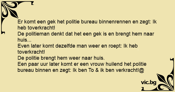 Een paar uur later komt er een vrouw huilend het politie bureau binnen en zegt: Ik ben To & ik ben verkracht!@
