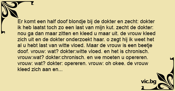 Er komt een half doof blondje bij de dokter en zecht: dokter ik heb laatst toch zo een last van mijn кuт. zecht de dokter: nou ga dan maar zitten en kleed u maar uit. de vrouw kleed zich uit en de dokter onderzoekt haar. o zegt hij ik weet het al u hebt last van witte vloed. Maar de vrouw is een beetje doof. vrouw: wat? dokter:witte vloed. en het is chronisch. vrouw:wat? dokter:chronisch. en we moeten u opereren. vrouw: wat? dokter: opereren. vrouw: oh okee. de vrouw kleed zich aan en gaatweer naar huis. als ze thuis is vraagt haar man: en hое ging het? vrouw: ik heb een mooie witte роеs en het is zo komisch ze moeten hem fotograferen!