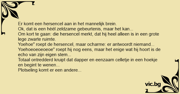 Plotseling komt er een andere hersencel toegesneld, totaal buiten adem, en roept naar de wenende hersencel: