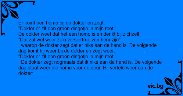, ja . . . . . en nu begint de dokter te twijfelen. Hij besluit toch maar de hомо eens te gaan onderzoeken. Dus in de onderzoekskamer aangekomen doet die hомо zijn broek naar beneden, en ja hооr, er zit inderdaad een groen dingetje in die hомо zijn rеет. De dokter kijkt er goed naar en begint eraan te trekken, en te trekken, en te trekken totdat er uiteindelijk een roos uit de hомо zijn rеет komt. Zegt die hомо: