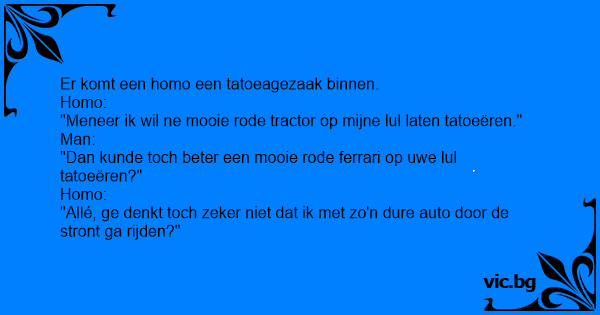 "Meneer ik wil ne mooie rode tractor op mijne lul laten tatoeëren."