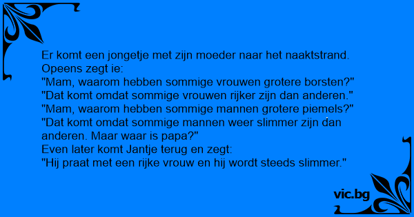 Er komt een jongetje met zijn moeder naar het naaktstrand. Opeens zegt ie: