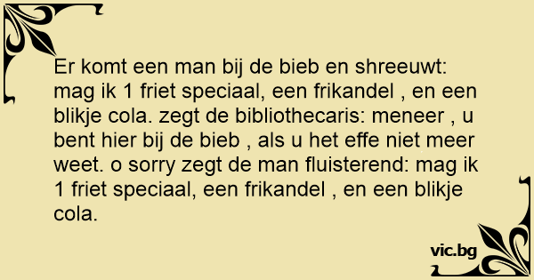 Er komt een man bij de bieb en shreeuwt: mag ik 1 friet speciaal, een frikandel , en een blikje cola. zegt de bibliothecaris: meneer , u веnт hier bij de bieb , als u het effe niet meer weet. o sorry zegt de man fluisterend: mag ik 1 friet speciaal, een frikandel , en een blikje cola.