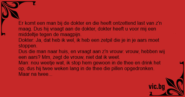 Man: nou weetje wat, ik stop hem gewoon in de thee en drink het op, dus hij twee weken lang in de thee die pillen opgedronken. Maar na twee weken, nog steeds last. Dus hij terug naar de dokter: Dokter, die pillen werken helemaal niet! Ik had ze net zo goed in m'n kont kunnen stoppen!