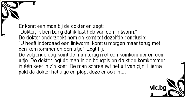 "U heeft inderdaad een lintworm, komt u morgen maar terug met een komkommer en een uitje", zegt hij.