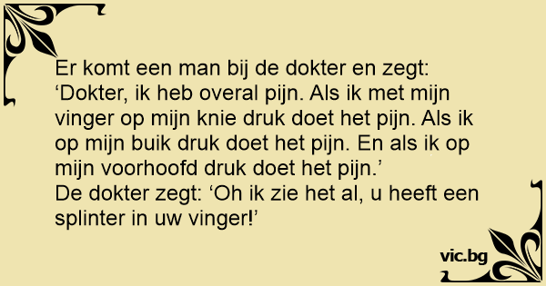 Er komt een man bij de dokter en zegt: ‘Dokter, ik heb overal pijn. Als ik met mijn vinger op mijn knie druk doet het pijn. Als ik op mijn buik druk doet het pijn. En als ik op mijn voorhoofd druk doet het pijn.’